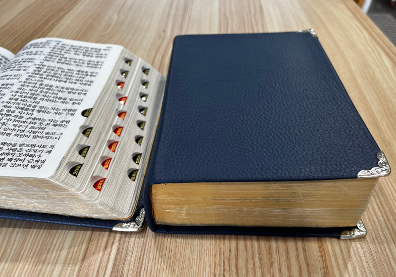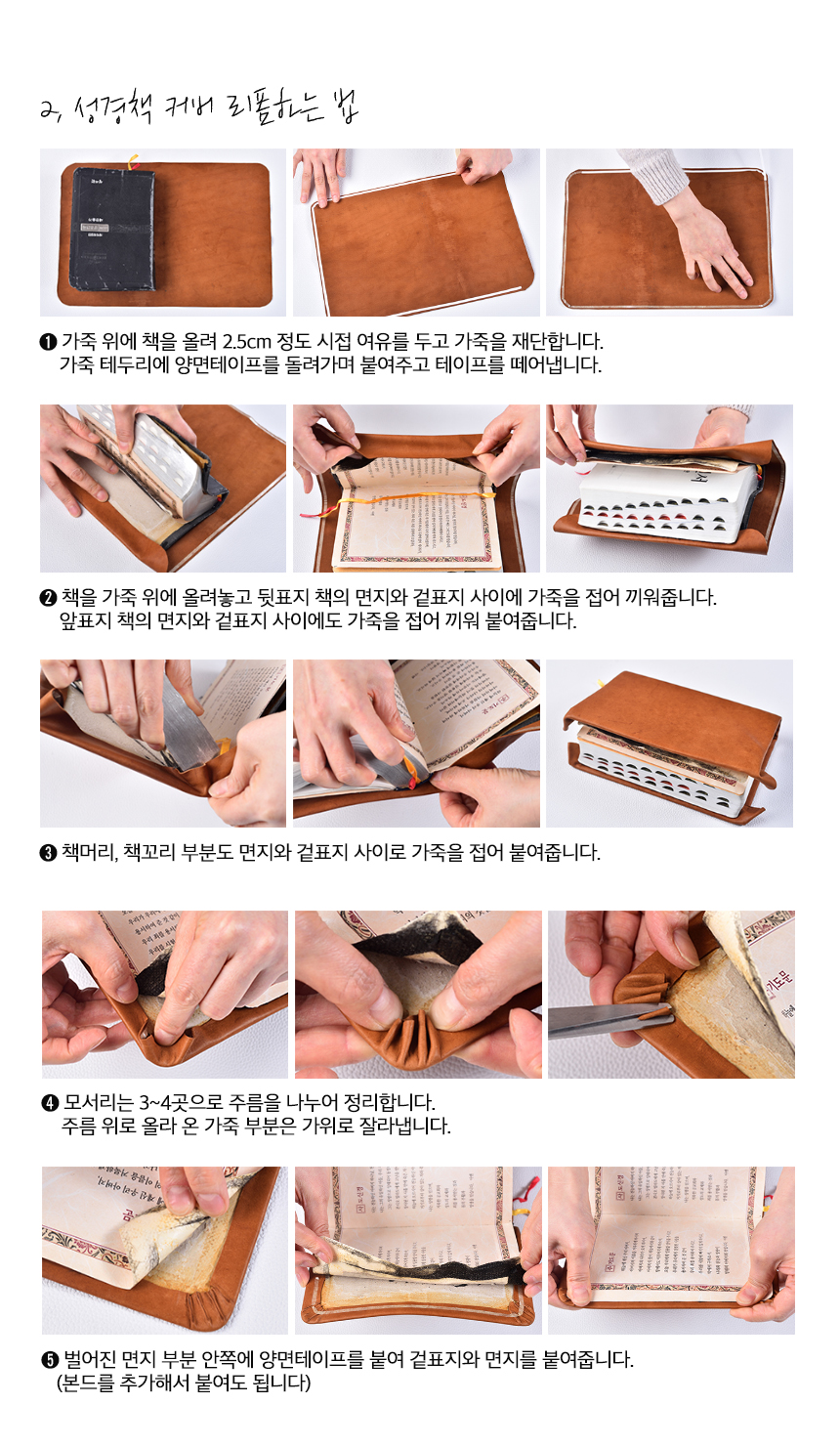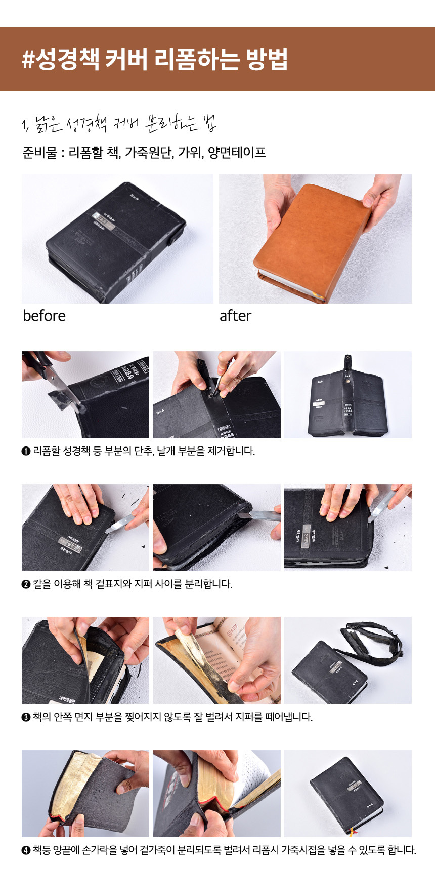 그러다 보니, 빈손으로 예배를 드리러 오는 이들을 위해 교회 비치용 성경책이 있는 건데, 오래 사용하면서 꼭 문제가 되는 부분이 바로 커버입니다. 갈라지고 뜯어지고 가루가 날려 흉물스럽게 변한 성경책, 그렇다고 함부로 버릴 수도 없는 성경책, 그 고민을 커버 교환 작업으로 해결해 보았습니다. 물론, 내가 아니라 손재주 많은 아내가 한 것입니다.